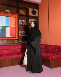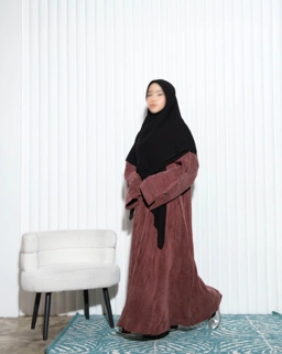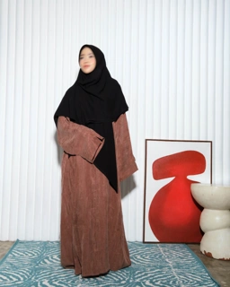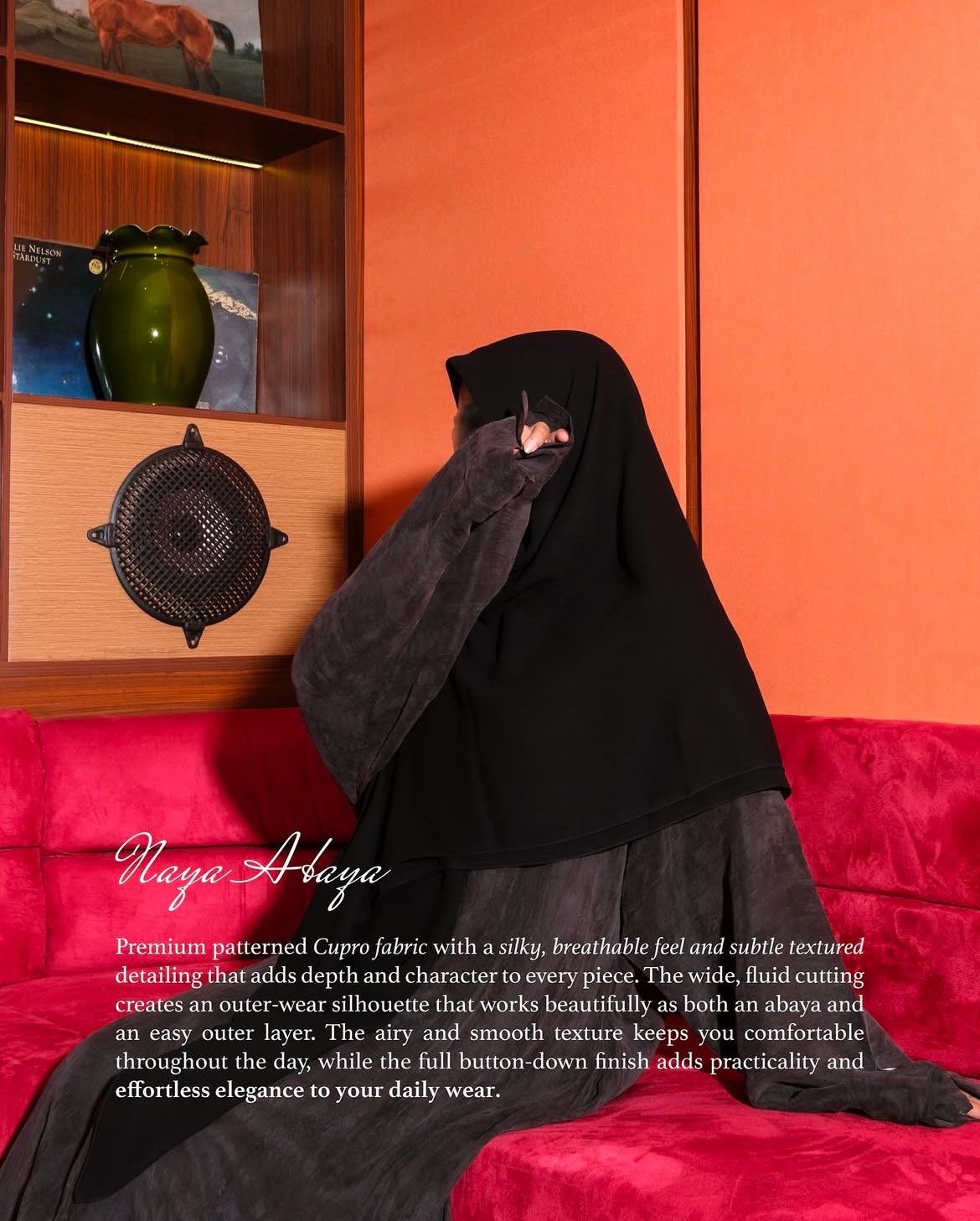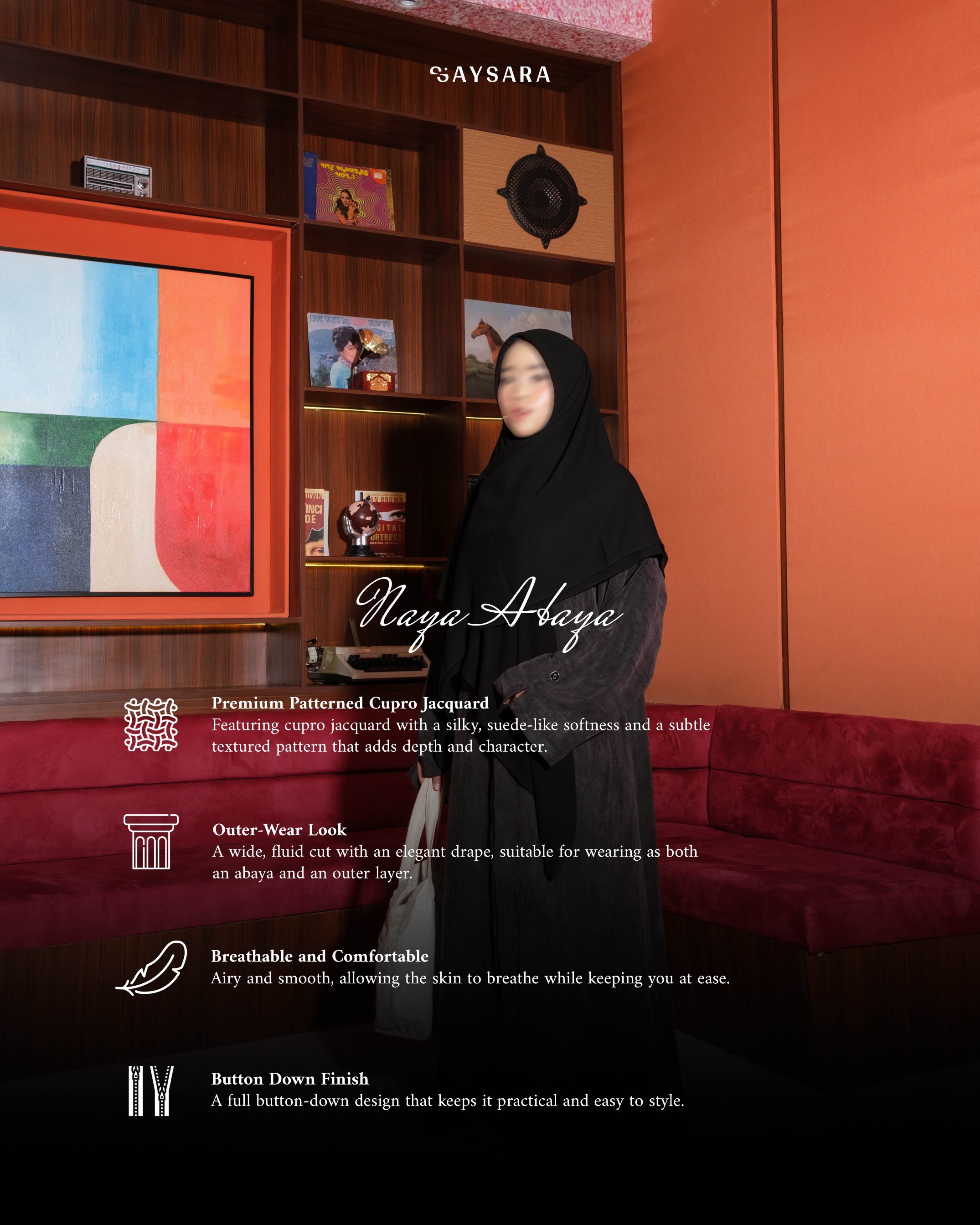 Premium patterned Cupro Jacquard with a silky, breathable feel and subtle textured detailing that adds depth and character to every piece. The wide, fluid cutting creates an outer-wear silhouette that works beautifully as both an abaya and an easy outer layer. The airy and smooth texture keeps you comfortable throughout the day, while the full button-down finish adds practicality and effortless elegance to your daily wear.