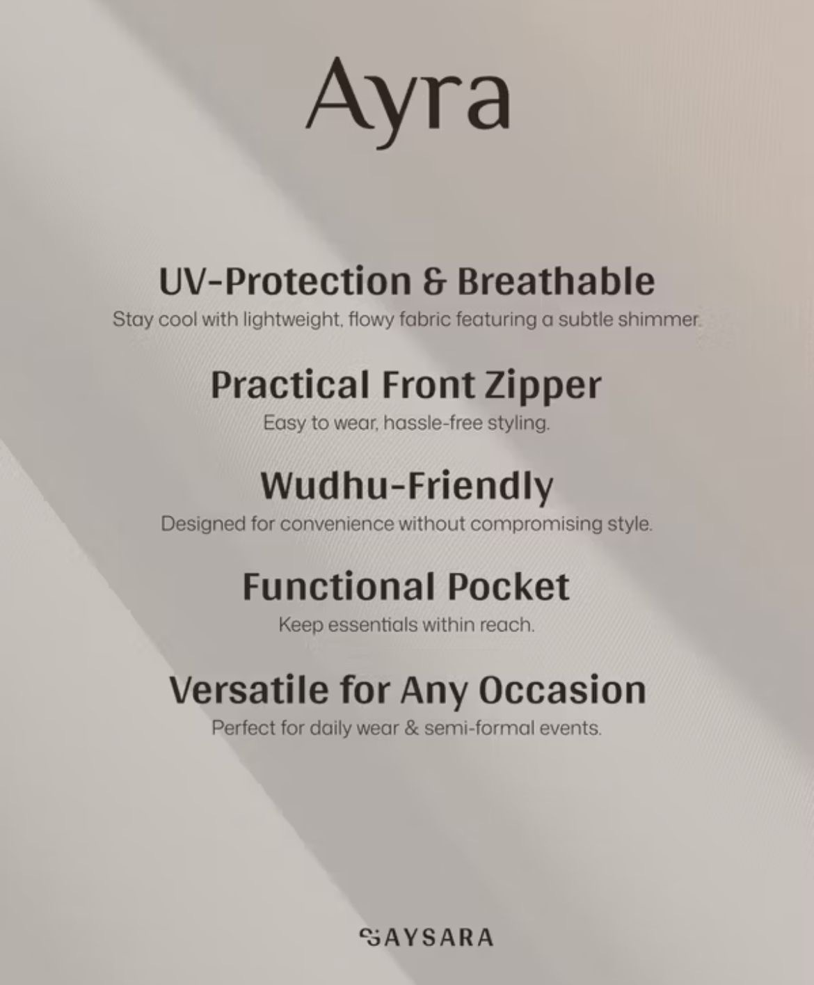 Didedikasikan untuk perempuan yang mencintai kenyamanan dalam penampilan, ayra dirancang untuk menemani keseharian saysist yang produktif dengan material anti uv yang inovatif, dengan beberapa fitur penunjang diantaranya.